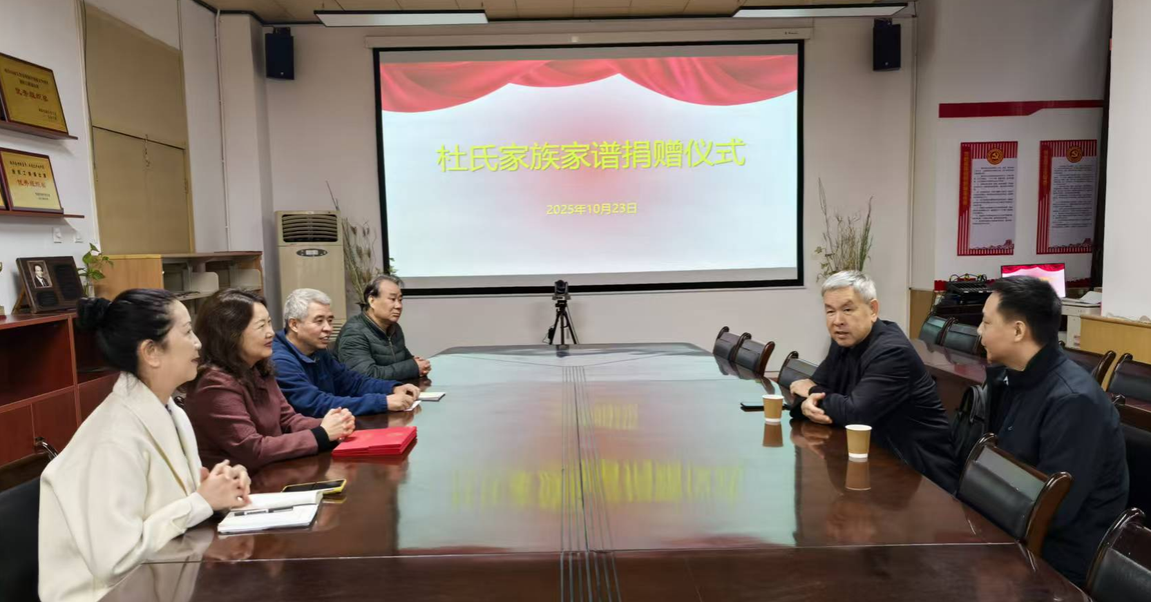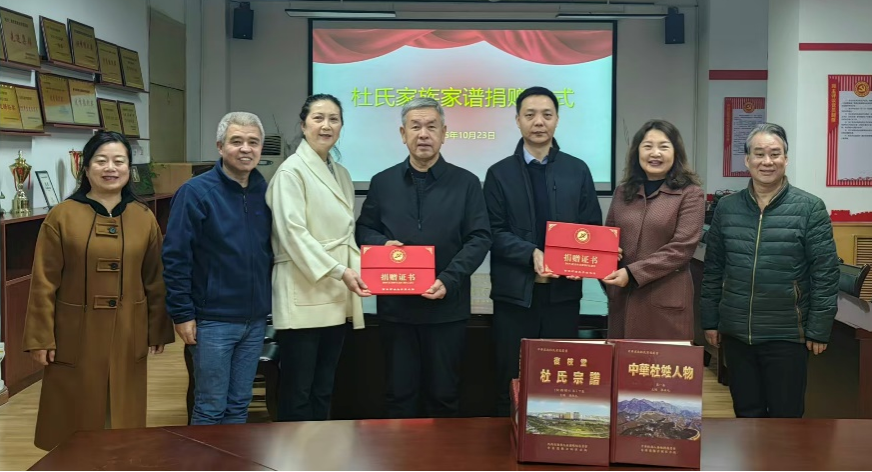 2025年10月23日上午,陕西省杜斌丞教育思想研究会会长,陕西姓氏文化研究会杜氏文化专委会杜芳滨先生与杜氏族谱编撰主要联系人杜涛先生来到我校图书馆,向图书馆捐赠了《杜氏宗谱》《中华杜氏通谱-名人卷》《中华杜姓人物》等家谱类图书共6册。